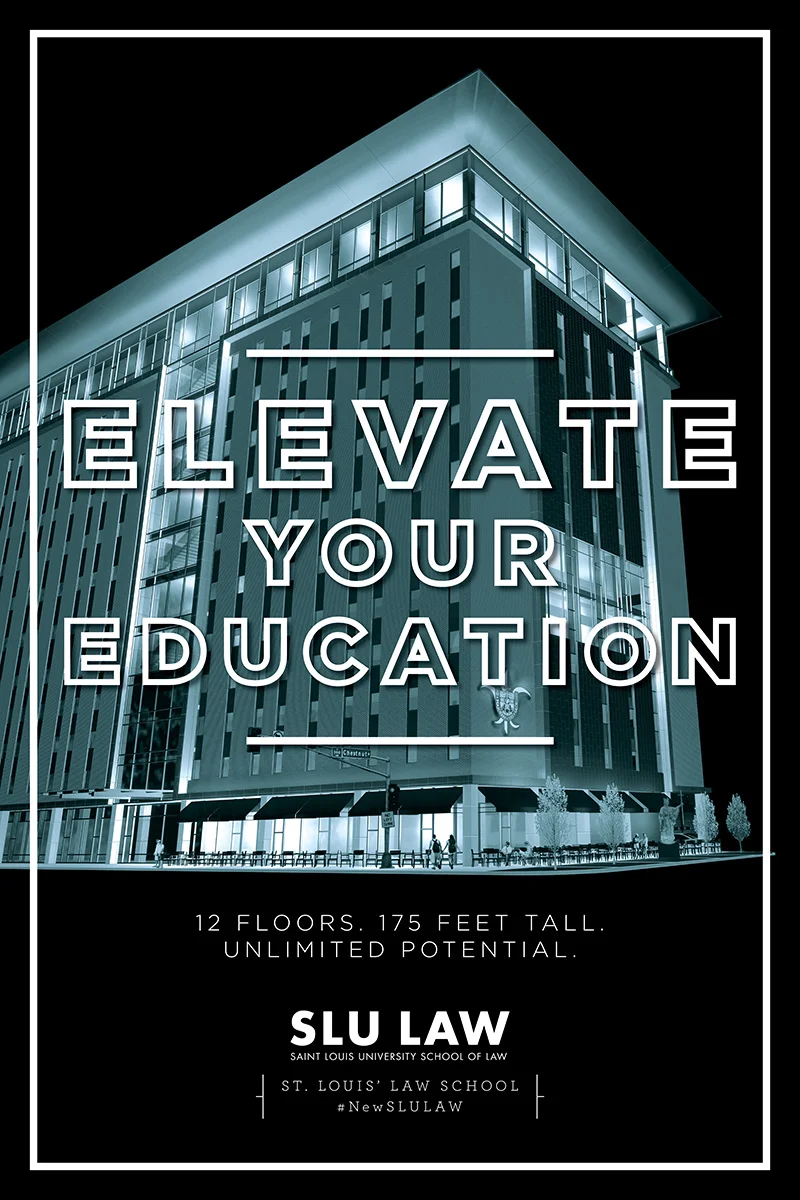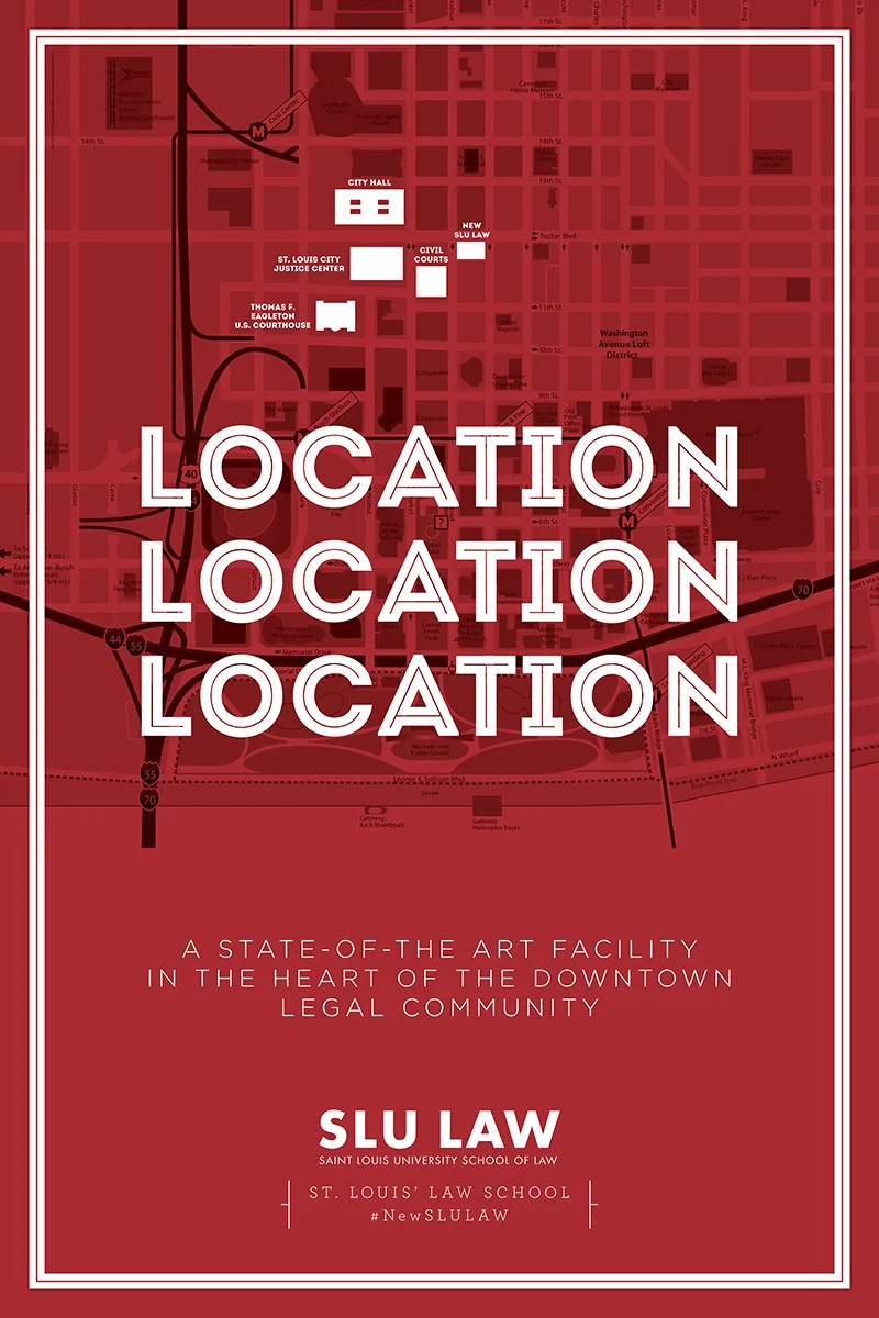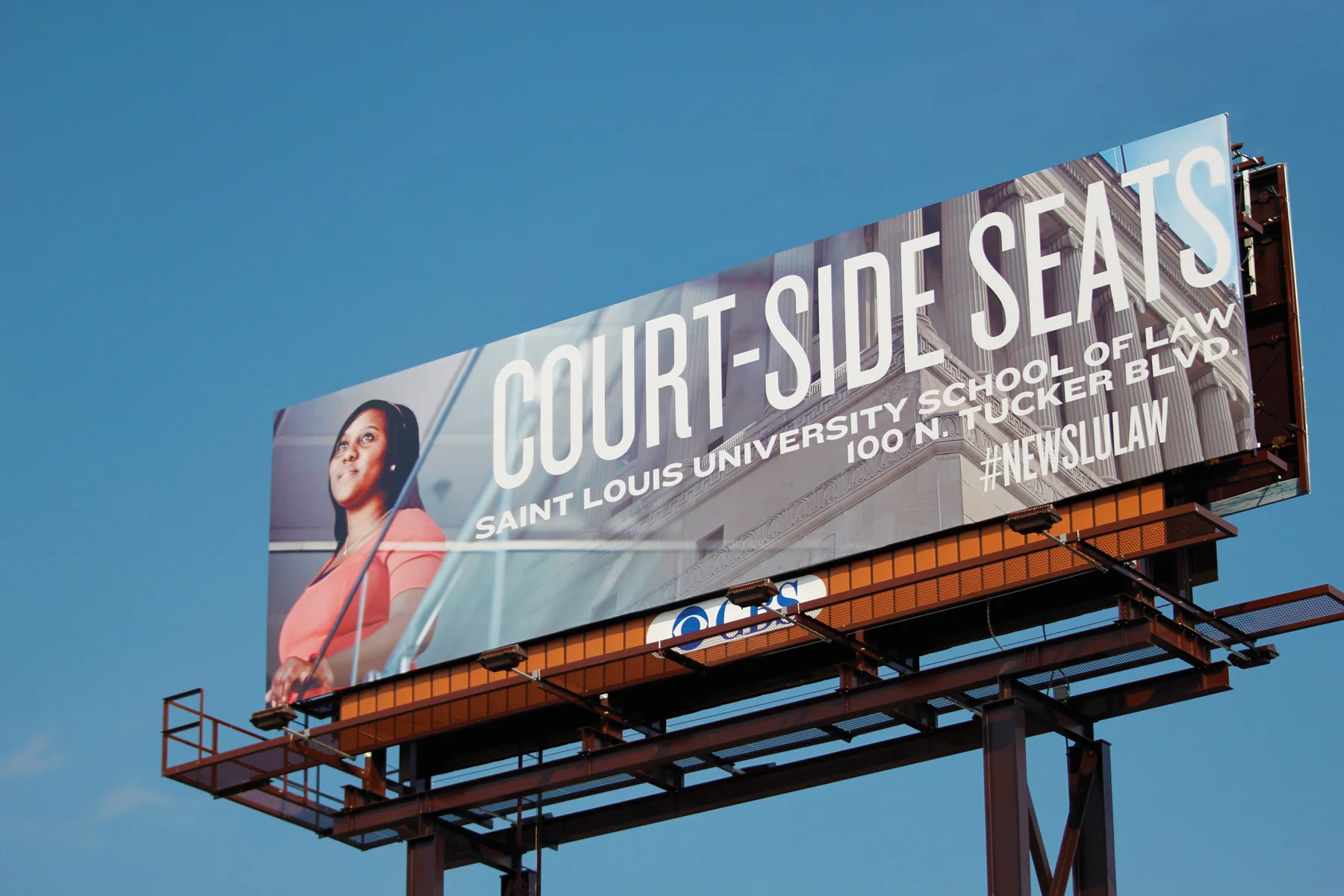 top_ One of several billboards highlighting Saint Louis University School of Law's new downtown location. The tagline references the school's proximity to the downtown courthouses and gets prospective students excited for this unique advantage to their legal career.